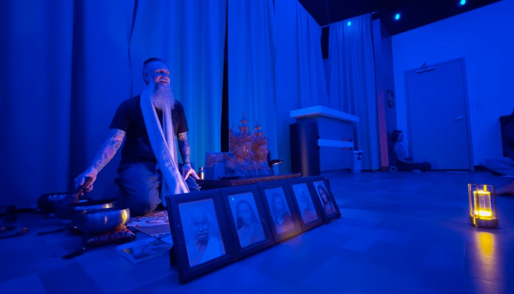 This sacred circle began humbly in the Palehorse art studio with one dear friend in 2017. As more friends were drawn to sit in silence together, Chris (Krishna Chandra) was led to the life-changing teachings of Yogananda and Swami Kriyananda, eventually receiving Kriya Yoga initiation in 2020 after a dedicated study and practice through courses with the monks and Nayaswamis of Ananda Village. These teachings continue to bless and transform his life, and he is honored to share them in the spirit of friendship and divine service.